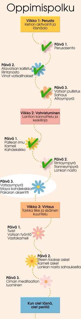 Toisella viikolla pääsit jo kokeilemaan pehmeitä vatsatanssin liikkeitä. Kehosi ehkä alkoi tunnistaa liikemalleja, ja liikkeestä tuli tutumpaa – ja ehkä jopa nautinnollista.