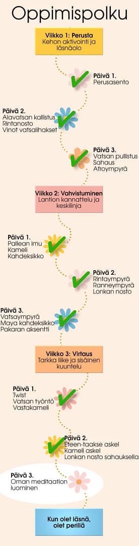 Viimeisellä viikolla harjoitukset vaativat hieman enemmän tarkkuutta ja keskittymistä. Kokeilit askelluksia ja sait myös mahdollisuuden luoda oman meditatiivisen liikehetken.